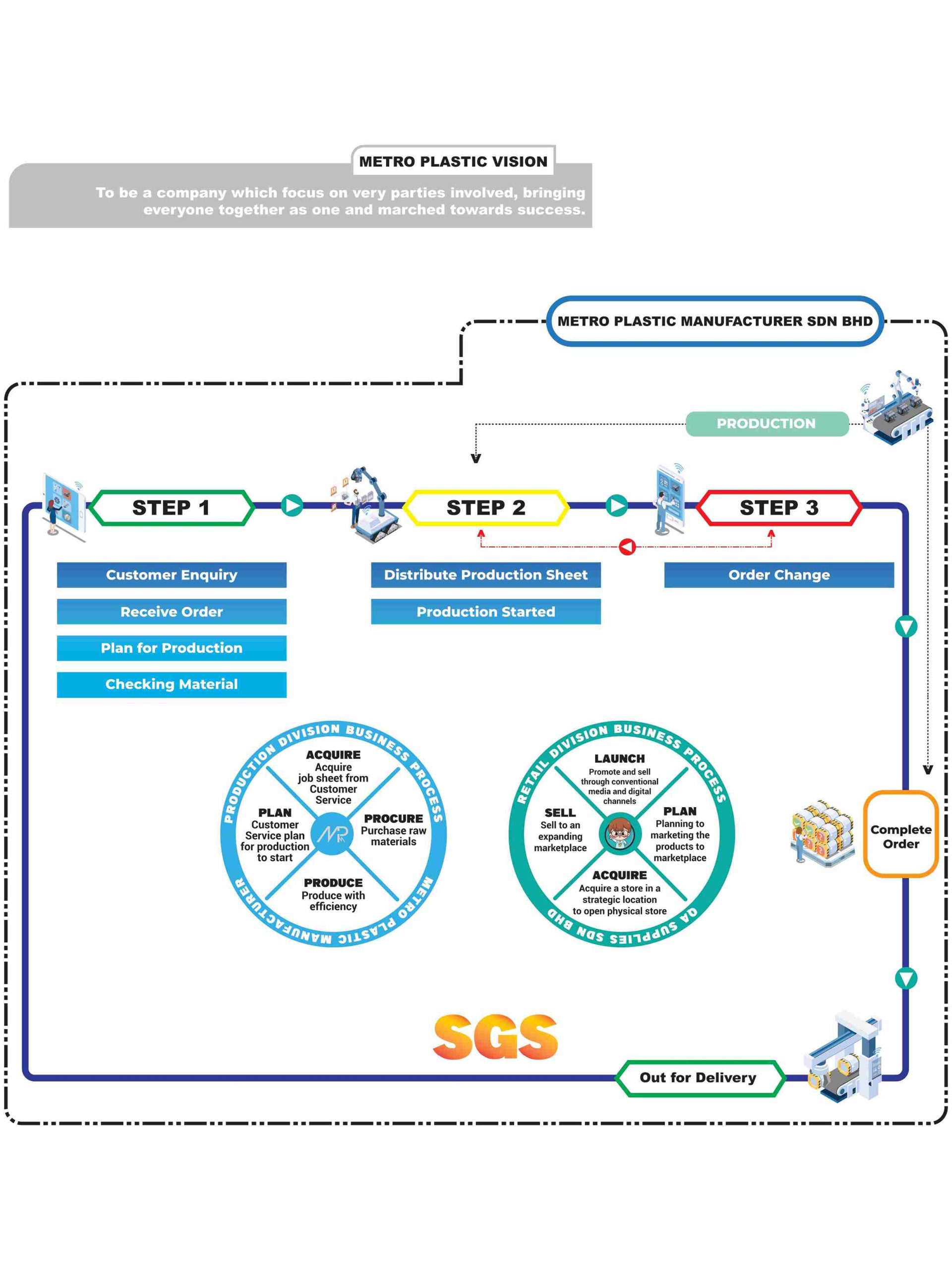 The production planning process can ensure the smooth process flow. It can ensure that the right type of product and quantities are planned, manufactured, inspected, and delivered on time base on customer requirement. Under controlled circumstances, finished products can be delivered with proper handle to prevent damage or deterioration, delivery can be carried out in accordance with specific requirement. The process flow is interconnected by administration and production department. All parties involved play a major role in ensuring everything is in accordance with the production planning. Administration plays the role of connecting to the external parties including suppliers, customers, and others. Meanwhile, production play the role of ensuring the orders requested by the administration are to be delivered. The production process is recorded in the quality handbook which is comply with the ISO 9001:2015 standard.